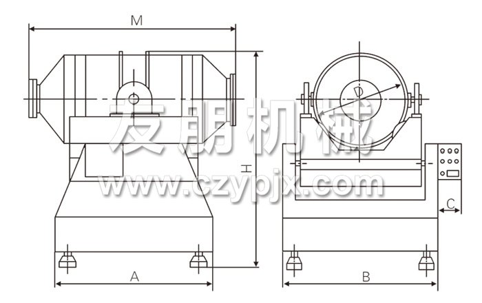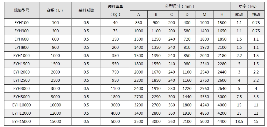 Performance characteristicsThe rotary drum of the EYH two-dimensional mixer can perform two movements simultaneously, one is the rotation of the rotary drum, and the other is the swing of the rotary drum with the swing frame. The mixed material rotates, flips, and mixes inside the drum, while also undergoing left and right back and forth mixing movements with the swinging of the drum. Under the combined action of these two movements, the material is fully mixed in a short period of time. The EYH two-dimensional mixer is suitable for mixing all powder and granular materials.